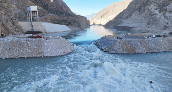 针对工程截流这一关键环节,水电五局建设者们凝心聚力、精心组织。通过对两岸及河床的地形分析,并结合流量、落差、流速等水文条件,反复优化、论证截流方案并提前组织专家评审;根据岩石特性,分别选择石渣料、中石、大石、特大石、钢筋石笼和混凝土四面体作为截流抛投料物;施工阶段建立“统一指挥、分工明确、协同高效”的作业机制,强化现场人员、设备;同时,过程中对水流速度、流量等水情变化进行实时监测,并根据监测数据动态调整抛投石料的类型、强度和顺序,确保截流作业安全可控、精准高效,顺利实现截流目标。