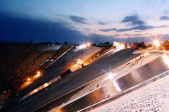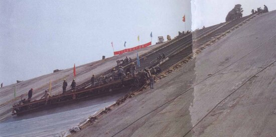 上水库的库区地质堪称“地质博物馆”:岩石裂缝纵横交错,风化严重得像酥饼,透水性极强,地下水位低得几乎“干涸”。更棘手的是,这里几乎没有天然径流,水从哪儿来?全靠上下库的“水循环魔术”。水电五局上水库建设团队紧盯地质难题,不断创新突破,采用“钢筋混凝土全库盆防渗”技术,给全部库岸、库底及主、副坝填筑体上游面库区披上了一层“铁布衫”——上水库混凝土面板堆石坝长464米、高70米(相当于24层楼);库周周长1628米,相当于240个标准足球场大小的175万平方米库盆全面衬护混凝土,这件密不透风的“雨衣”彻底堵住了漏水的“窟窿”。这是中国抽水蓄能电站首次大规模应用该技术,堪称“防渗教科书”。另外,上水库工程的建设规模更是搬山填谷的“超级工程”。其土石方工程包括明挖410万立方米、暗挖513万立方米、填筑289万立方米,相当于把半个山头“搬”走,又用土石堆出新的“人造山”。十三陵抽水蓄能电站的上水库,不仅以“全国最大人工水泥天池”的规模震撼世人,更以“全库盆防渗”“大落差循环”等创新技术,成为行业标杆。