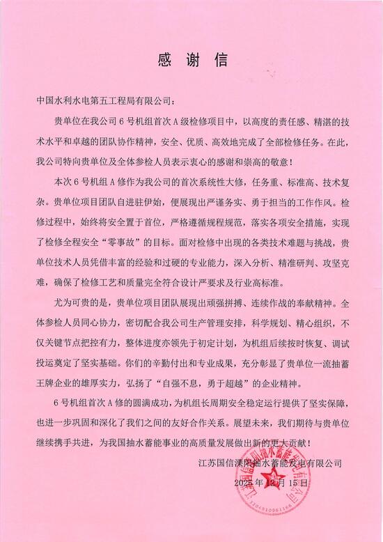 江苏国信溧阳抽水蓄能发电有限公司感谢信