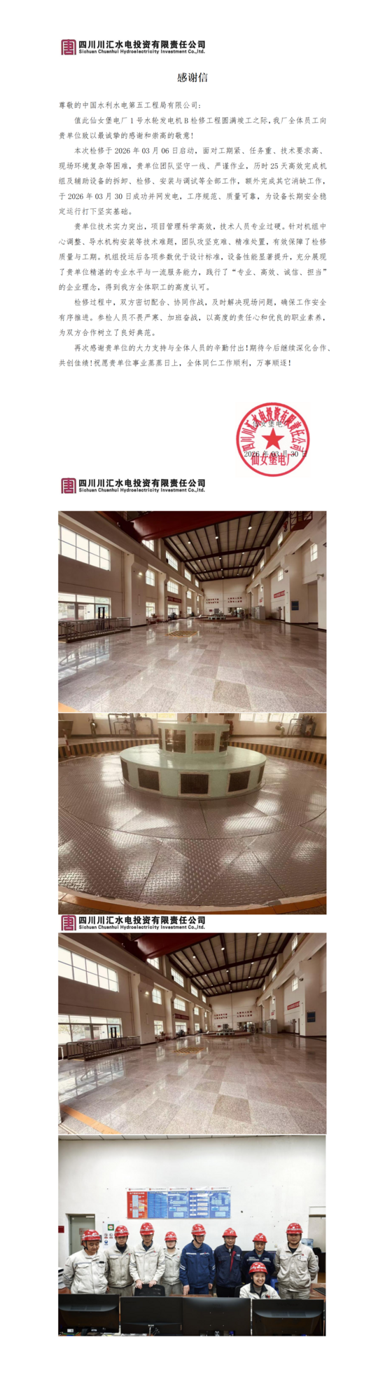 四川川汇水电投资有限责任公司仙女堡电厂感谢信