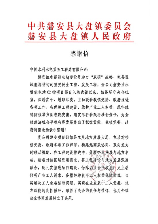 磐安县大盘镇人民政府感谢信