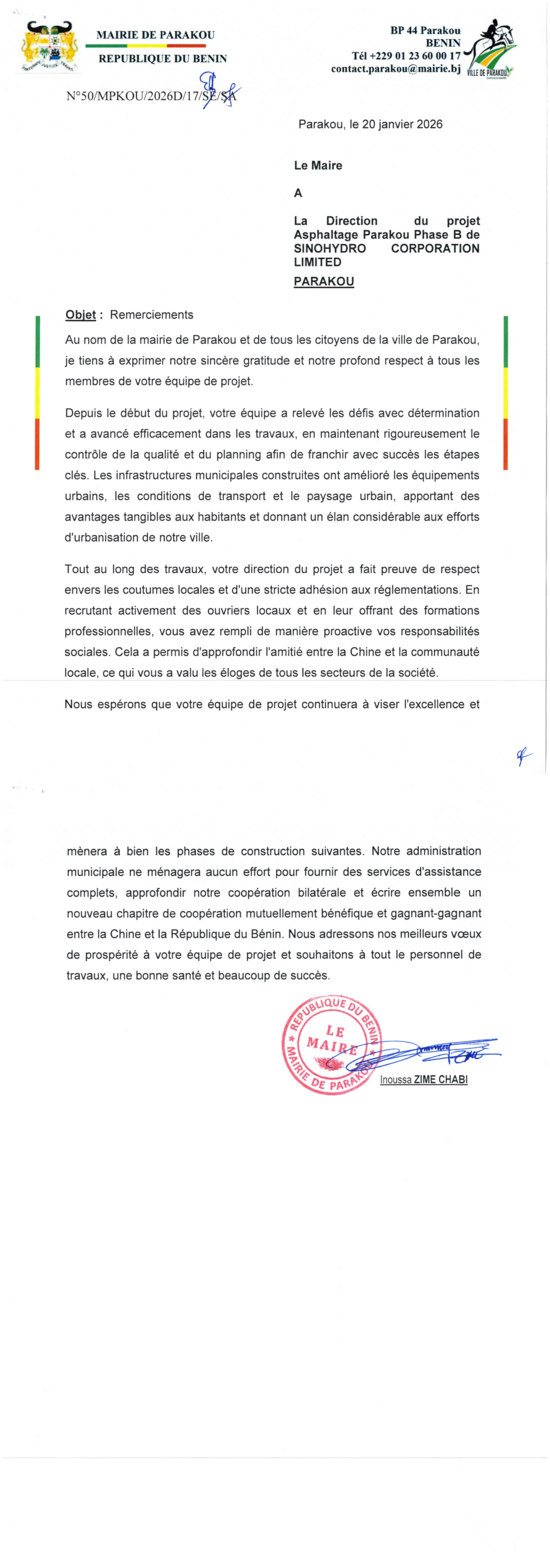 我们希望贵项目团队继续秉持精益求精的精神,圆满完成后续建设任务。帕拉库市政府将不遗余力地提供全方位协助,深化双方合作,共同谱写中贝互利共赢的合作新篇章。谨向贵项目团队致以最美好的祝愿,并祝全体施工人员身体健康、工作顺利!