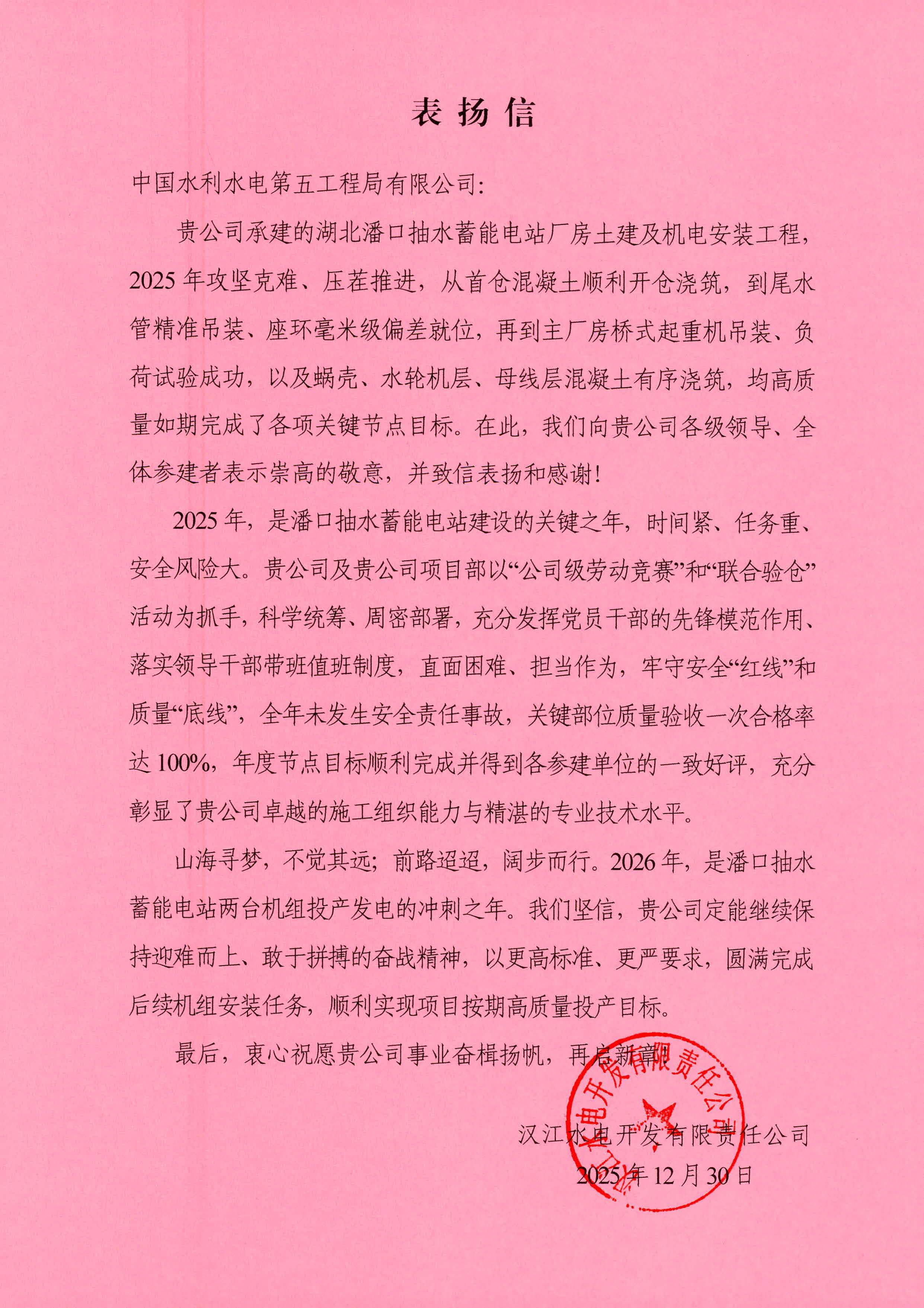 汉江水电开发有限责任公司表扬信