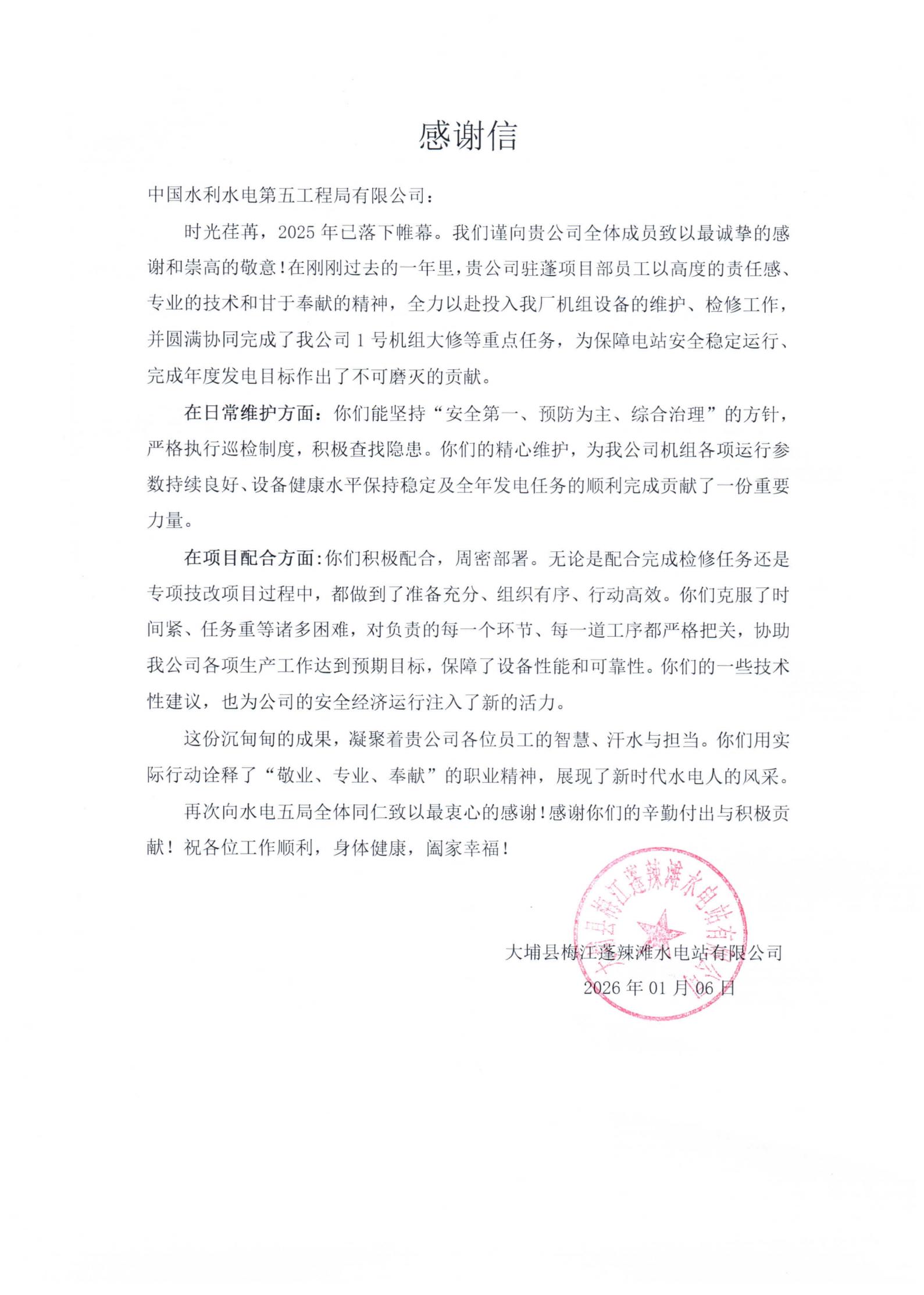 大埔县梅江蓬辣滩水电站有限公司感谢信