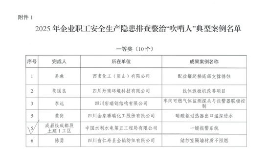 近日,眉山市总工会公布了2025年企业职工安全生产隐患排查整治“吹哨人”典型案例和优秀组织单位名单,成眉线土建项目案例“一键报警系统”荣获安全生产隐患排查整治“吹哨人”典型案例一等奖。