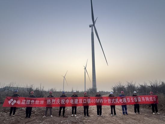 中电建双口镇40兆瓦分散式风电项目属平原风电场。项目核准装机容量40兆瓦,设计年平均发电量为1.273亿千瓦时。实际安装7台风力发电机组,单机容量为5.6兆瓦(6台)、6.25兆瓦(1台)。项目建成后,将为周边地区提供更多的清洁能源,带动地方经济快速发展和相关产业的联动建设,对扩大就业和活跃及发展第三产业起到很好的推动作用。