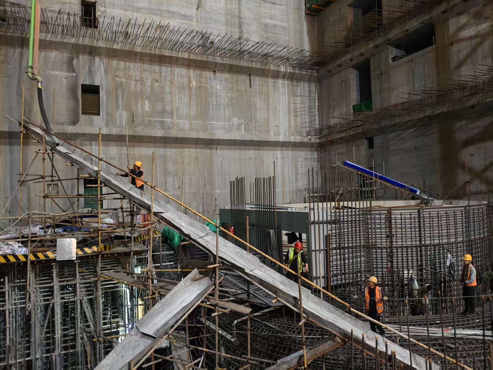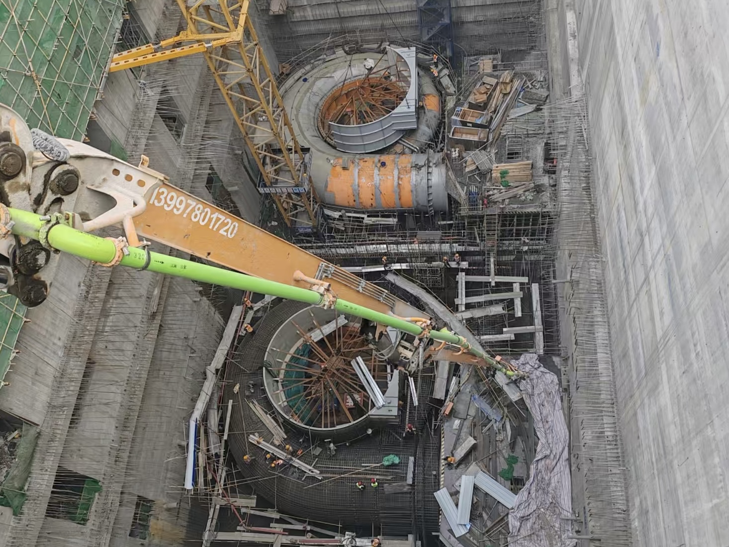 面对这些技术难题,项目部精心组织,提前谋划,制定了详细的施工方案。在入仓方式上,采用天泵结合溜管施工以及溜槽施工为主,“地泵+预埋管路”和“塔机+吊罐”为辅的综合入仓方案施工。针对阴角部位浇筑难点,施工团队巧妙运用“平铺法”与“台阶法”相结合的铺料工艺,并选用具有良好流动性的自密实混凝土,配合预埋灌浆管等辅助措施,有效确保了蜗壳的浇筑质量。在施工过程中,项目部严格执行技术交底制度,与设计、监理等单位密切配合,对混凝土配比、浇筑速度、温度控制等关键环节实施全过程监控。同时,高度重视施工安全管理,安排专人负责现场监督,确保浇筑作业安全有序进行。