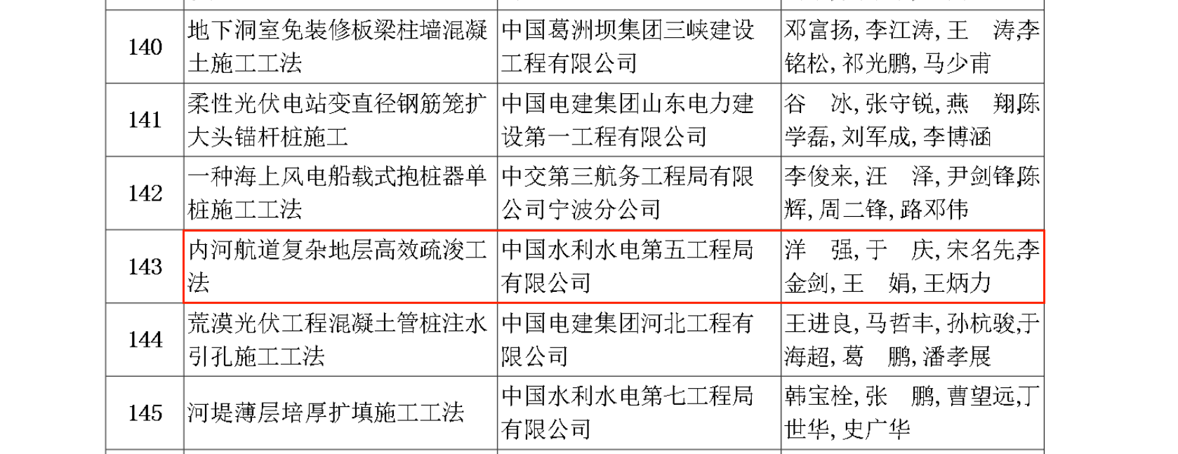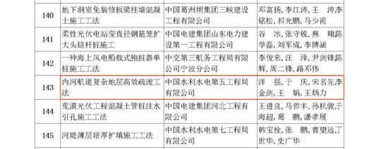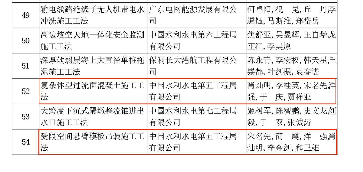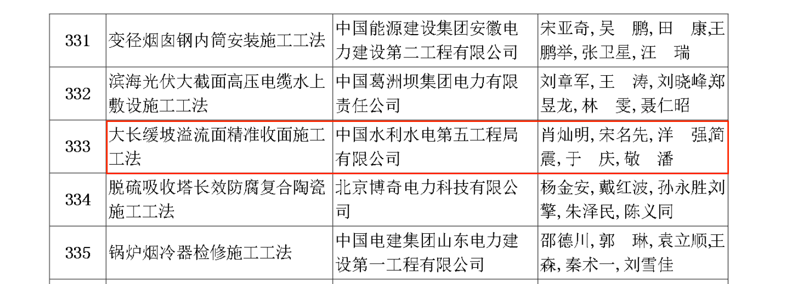 12月17日,从中国电力建设企业协会公布文件获悉,老木孔项目申报的6项工法全部获评电力建设工法,其中,《复杂体型过流面混凝土施工工法》《受限空间悬臂模板吊装施工工法》等2项工法获评“一等工法”,《航电工程混凝土智能施工工法》《航电枢纽复杂结构模板施工工法》《大长缓坡溢流面精准收面施工工法》《内河航道复杂地层高效疏浚工法》等4项工法获评“二等工法”。