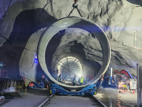 本次安装的压力钢管位于直径5.6米的下斜井段,是电站引水系统的核心组成部分。安装过程中,项目部制定了周密的专项施工方案。首先,采用“平板卡车+天锚+轨道运输台车”的组合方式进行钢管水平与斜井运输。精准运抵安装位置后,操作人员使用千斤顶将钢管顶升,并利用焊接托板等工艺措施,安全退出运输台车。随后,通过螺旋千斤顶精细调整钢管的中心、高程及倾斜度,遵循“先粗调后精调”的原则,在各项位置参数完全符合设计要求后,立即进行加固焊接,确保安装稳固。