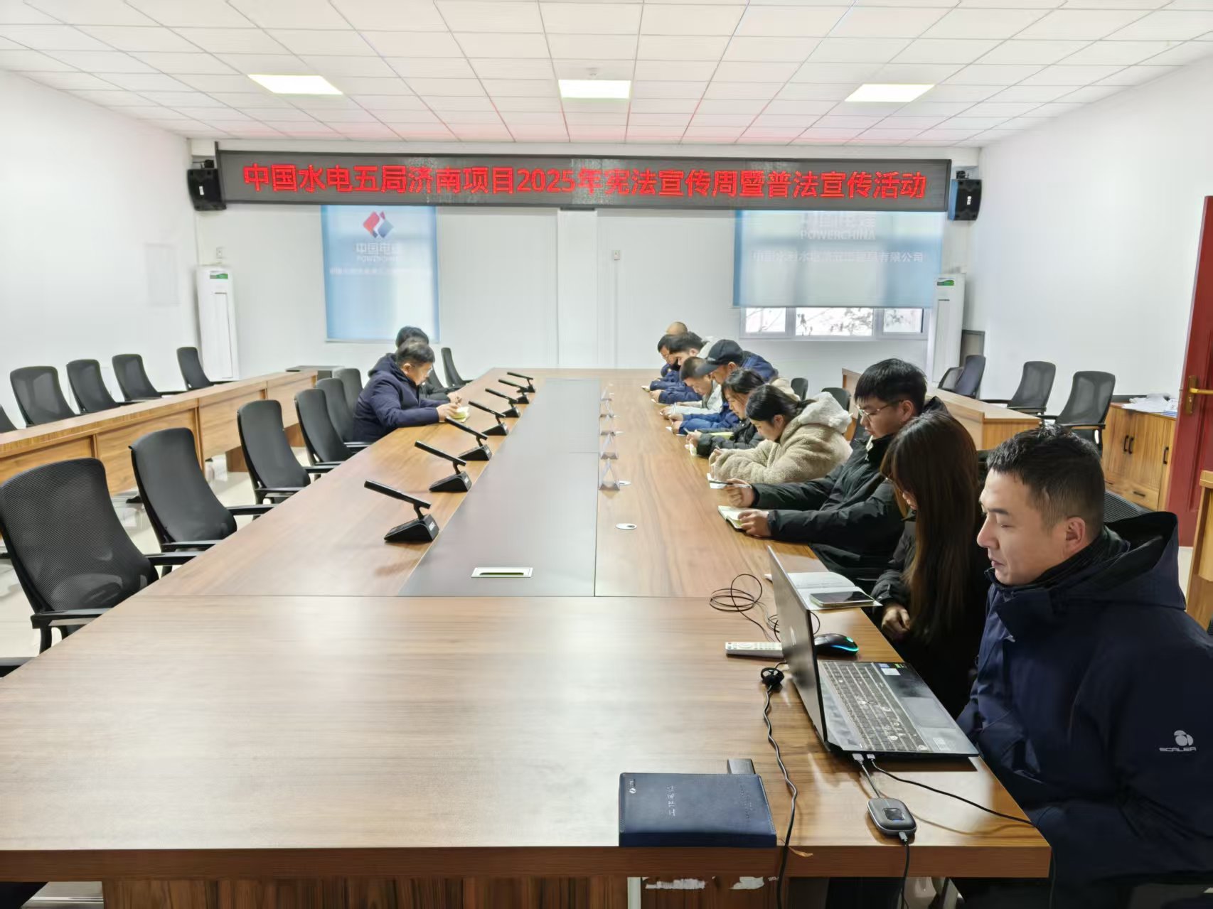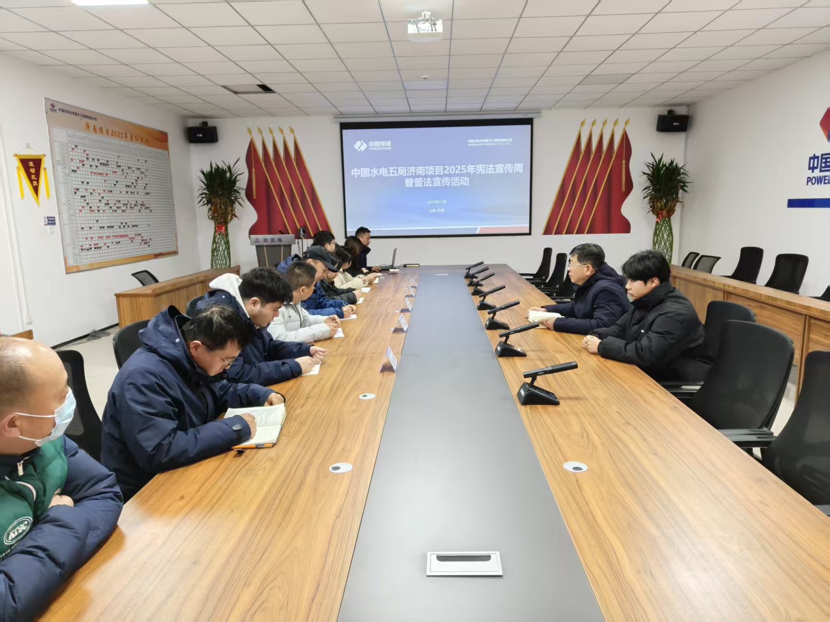 深化理论学习,筑牢思想根基。济南项目组织全体人员集中学习习近平总书记《坚定不移走中国特色社会主义道路 为全面建设社会主义现代化国家提供有力法治保障》的重要论述,重点解读《中华人民共和国法治宣传教育法》中的“公民终身法治教育”“谁执法谁普法”等关键制度,明晰项目建设“尊法、学法、守法、用法”实践路径;磐安项目聚焦宪法知识与新时代法治建设,学习习近平总书记在中央全面依法治国工作会议上的重要讲话,通过《宪法知识竞赛题库》问答研讨,巩固了宪法基础知识;潘口项目党支部副书记结合项目实际,深入解读,引领项目员工学习习近平总书记在中央全面依法治国工作会议上提出的“11 个坚持”,让员工们充分认识到依法履职的重要性;天津项目依托线上微信群、五局学堂及线下“党建早课堂”平台,系统解读党的二十届四中全会精神、《中华人民共和国宪法》等内容,以案例剖析深化理解,构建“党建引路、法治同行”良好格局。