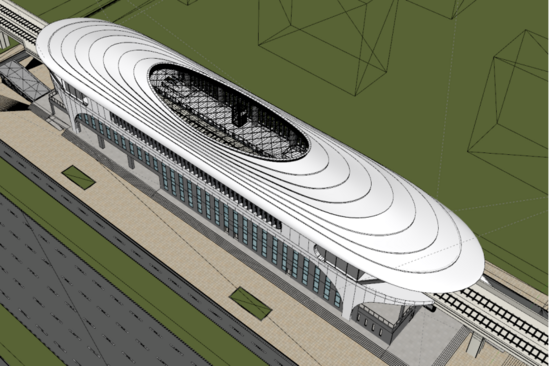 岷东新区站位于眉山市岷东大道以东860米处、在建天府大道北侧规划绿地范围内,线路沿天府大道呈东西走向布置。车站站台层主体采用钢框架结构,柱距约12米,最大跨度约22.3米。钢结构体系具有质轻高强、安全可靠、绿色环保的突出优势,不仅能完美适配车站大空间使用需求,更能塑造出独特新颖的建筑形态,实现实用性与美观性的有机统一。