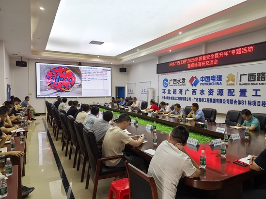 4月14日下午,环北广西工程“2026年质量安全提升年”专题活动暨现场调研交流会在B1标项目成功举办。水发集团建设管理部、各片区指挥部、勘察设计、监理及各施工标段相关负责人参加活动。