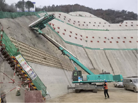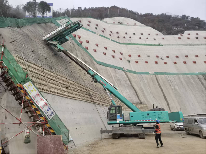 针对大型设备的视线盲区,项目部装设了高灵敏度红外线感应报警器,配备智能语音播报模块与高分贝声光报警器。当监测到行人、机具进入危险区域时,设备立即发出“盲区危险,请勿靠近”的语音提示,从源头杜绝机械伤害事故。在高边坡施工中,高臂台车进行边坡锚杆、挂网作业,天泵改造的湿喷车替代了传统的人员喷护作业方式,既减少了作业人员数量,又大幅提升本质安全水平。