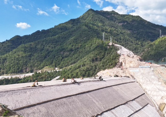 当最后一车填筑料在10月30日的晨光中倾泻而下,永嘉抽水蓄能电站下水库大坝顺利填筑到顶,如巨龙般昂首矗立。