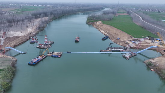 “沉管就像在水下‘穿针’,偏差过大上下游管口就无法合拢。”吊点选在哪?每个阶段注多少水?吊力应该控制在多少吨?管子的挠度允许是多少……一系列影响管道下沉的参数都需要进行全面考量。首次沉管作业时,河面寒风夹杂着水汽扑面而来,施工人员裹紧工装,手中的对讲机不时传来指令与回应。作业人员轮班值守,眼睛熬得通红,每一次姿态调整都要反复核对数据,每一次指令下达都要精准无误。36小时后,钢管最终平稳着床,轴线偏差得到有效控制,经权威检测,沉管对接渗漏量为零,远优于水利工程验收标准,成功实现“水下无缝衔接”的技术突破。