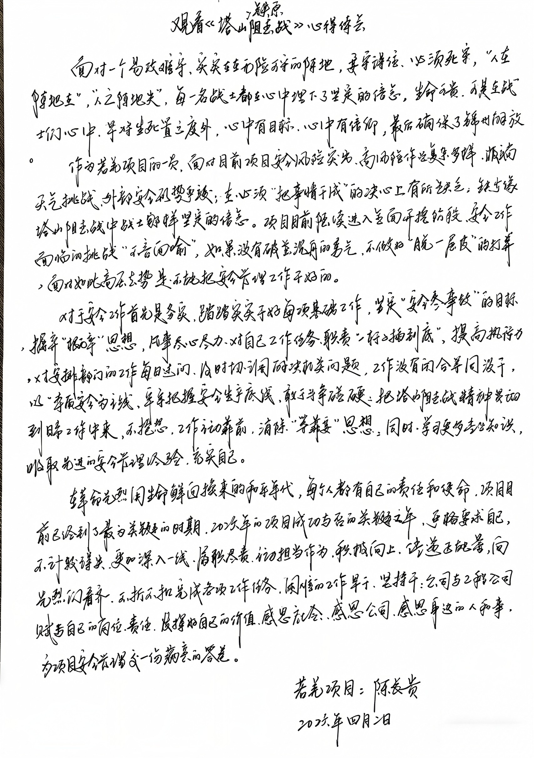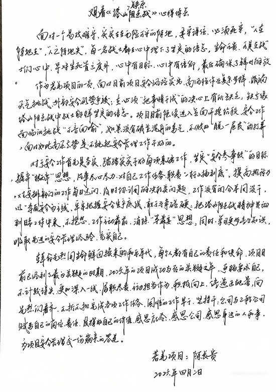 一次,项目部组织观看《塔山阻击战》《铁原阻击战》。陈长贵坐在前排看得十分认真,并时不时拿着一些东西。结束后不久,他手写的一篇读后感在同事们的赞叹中传开了,工整的文字中有一段格外醒目:“目前项目安全任务复杂多样,我们在心理上‘把事情干成’的决心有时还不够,缺乏影片中战士那样坚定的信念。安全工作必须务实,踏踏实实干好每项基础工作,消除‘等靠要’思想,敢于斗争碰硬,同时学习更多专业知识,吸取更多的安全管理经验以充实自己。”读罢此文,再看着陈长贵每日穿行于戈壁深处的身影,便不难理解:他的尺子是长在心里的。