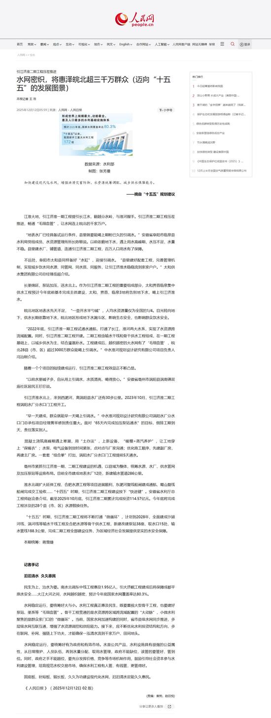 “2022年底,引江济淮一期工程试通水通航,打通了长江、淮河两大水系,实现了水资源跨流域配置。同时,引江济淮二期工程开建。二期工程由输水干线和骨干供水工程组成,在一期工程基础上,以城乡供水为主,结合灌溉补水。工程建成后,越织越密的大水网有了‘毛细血管’,皖北28县(市、区)超过3000万群众能喝上引调水。”中水淮河规划设计研究有限公司项目负责人冯治刚介绍。