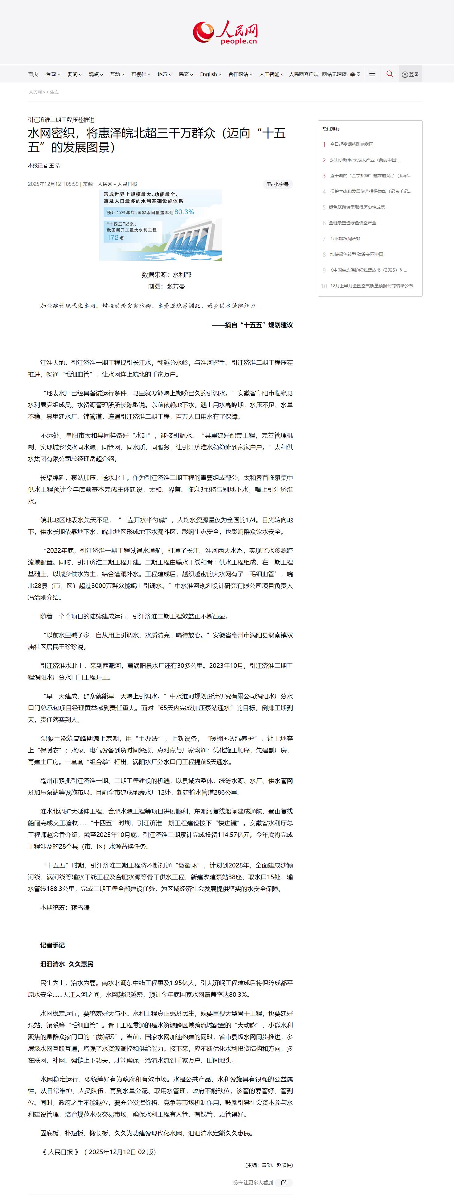 民生为上,治水为要。南水北调东中线工程惠及1.95亿人,引大济岷工程建成后将保障成都平原水安全……大江大河之间,水网越织越密,预计今年底国家水网覆盖率达80.3%。