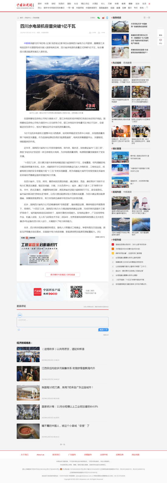 中新网成都12月19日电 (记者 刘忠俊)记者19日从国网四川省电力公司获悉,随着银江水电站220千伏渡银线成功接入国家电网主网,四川省水电装机容量正式突破1亿千瓦,标志着四川清洁能源发展迈入新阶段。