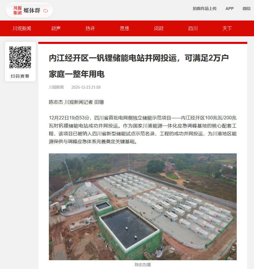 链接:内江经开区一钒锂储能电站并网投运,可满足2万户家庭一整年用电|川观新闻 https://cbgc.scol.com.cn/news/7100379