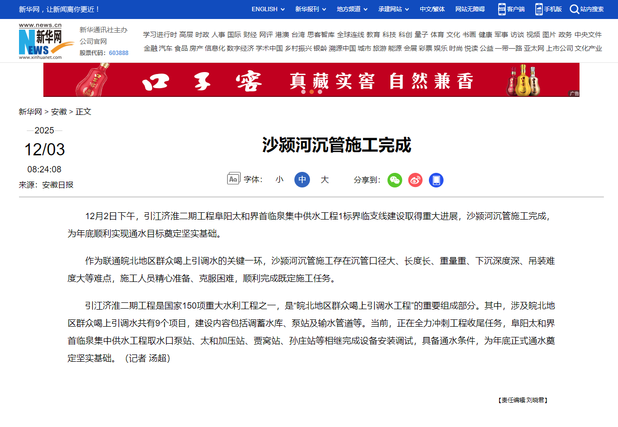 12月2日下午,引江济淮二期工程阜阳太和界首临泉集中供水工程1标界临支线建设取得重大进展,沙颍河沉管施工完成,为年底顺利实现通水目标奠定坚实基础。