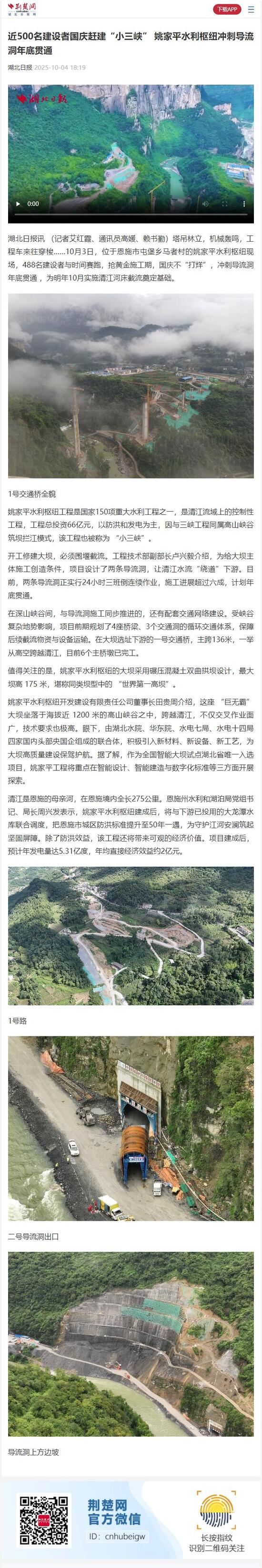 湖北日报讯 (记者艾红霞、通讯员高媛、赖书勤)塔吊林立,机械轰鸣,工程车来往穿梭……10月3日,位于恩施市屯堡乡马者村的姚家平水利枢纽现场,488名建设者与时间赛跑,抢黄金施工期,国庆不“打烊”,冲刺导流洞年底贯通 ,为明年10月实施清江河床截流奠定基础。