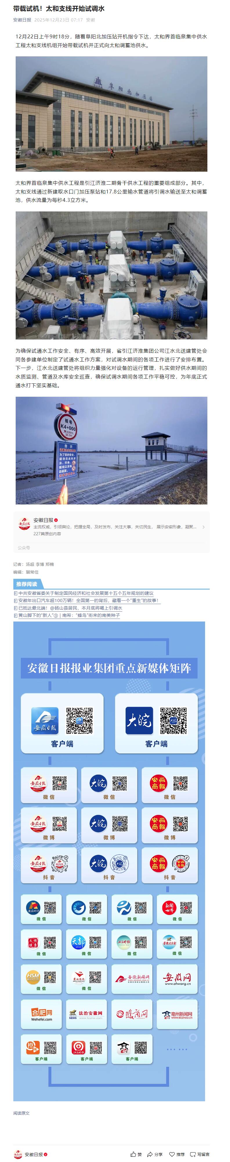 12月22日上午9时18分,随着阜阳北加压站开机指令下达,太和界首临泉集中供水工程太和支线机组开始带载试机并正式向太和调蓄池供水。