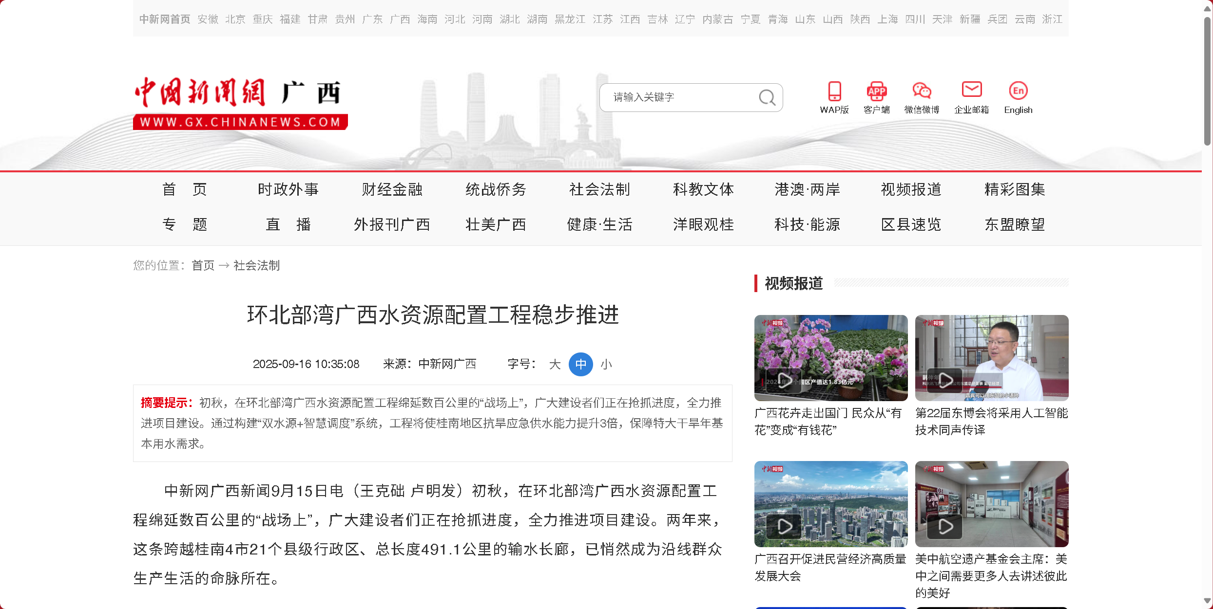 作为国务院部署实施的150项重大水利工程之一,环北广西工程自2023年9月8日开工建设以来,以郁江为核心水源,通过连通郁江与北部湾桂南诸河,串联西津、那板、凤亭河等15座大中型水库,构建起纵横交错的水资源配置网络,将有效缓解区域缺水情势,完善多水源供水保障格局。