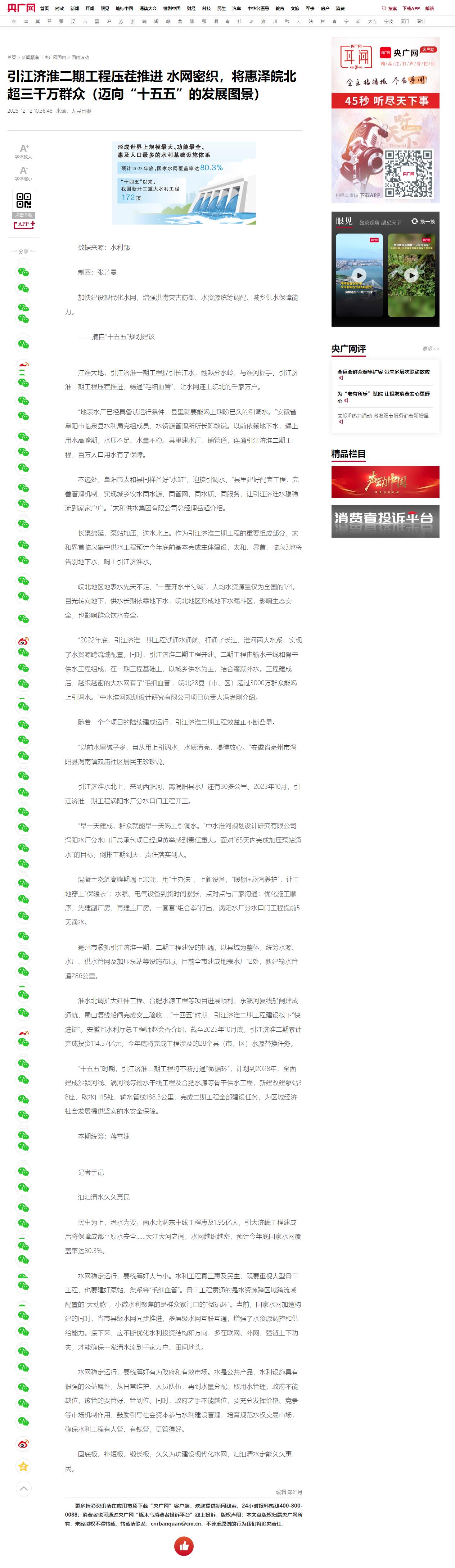 “2022年底,引江济淮一期工程试通水通航,打通了长江、淮河两大水系,实现了水资源跨流域配置。同时,引江济淮二期工程开建。二期工程由输水干线和骨干供水工程组成,在一期工程基础上,以城乡供水为主,结合灌溉补水。工程建成后,越织越密的大水网有了‘毛细血管’,皖北28县(市、区)超过3000万群众能喝上引调水。”中水淮河规划设计研究有限公司项目负责人冯治刚介绍。