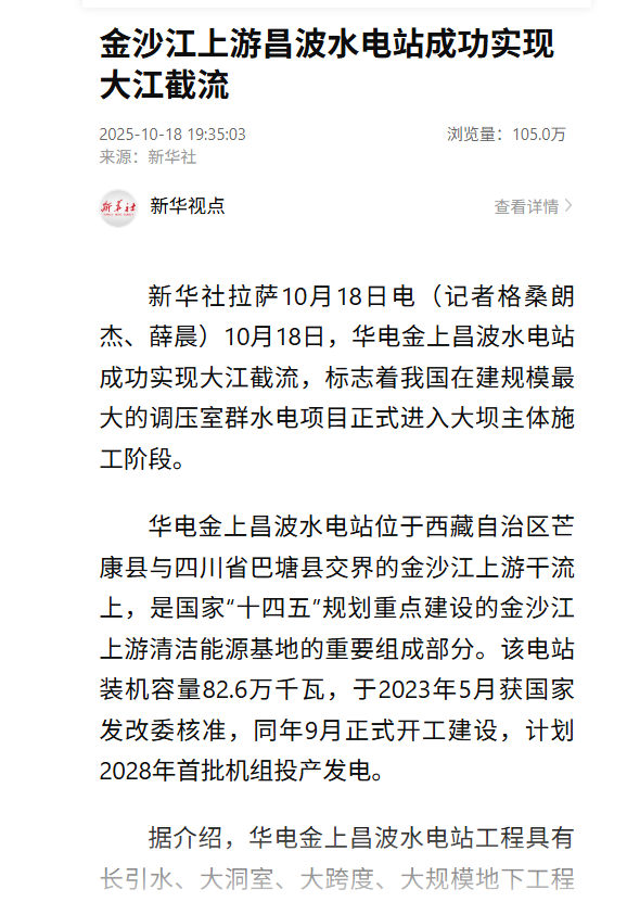 华电金上昌波水电站位于西藏自治区芒康县与四川省巴塘县交界的金沙江上游干流上,是国家“十四五”规划重点建设的金沙江上游清洁能源基地的重要组成部分。该电站装机容量82.6万千瓦,于2023年5月获国家发改委核准,同年9月正式开工建设,计划2028年首批机组投产发电。
