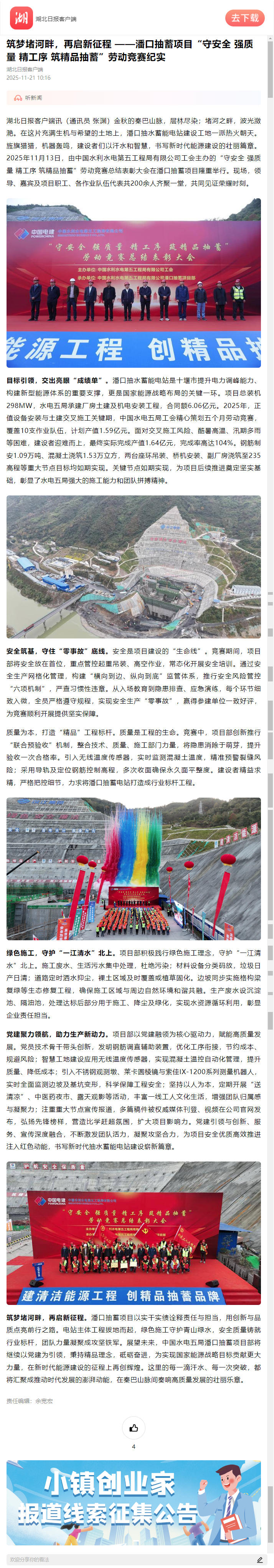 筑梦堵河畔,再启新征程。潘口抽蓄项目以实干实绩诠释责任与担当,用创新与品质点亮前行之路。电站主体工程拔地而起,绿色施工守护青山绿水,安全质量铸就行业标杆,团队力量凝聚成攻坚铁军。展望未来,中国水电五局潘口抽蓄项目部将继续以党建为引领,秉持精品理念,砥砺奋进,为实现国家能源战略目标贡献更大力量,在新时代能源建设的征程上再创辉煌。这里的每一滴汗水、每一次突破,都将汇聚成推动时代发展的澎湃动能,在秦巴山脉间奏响高质量发展的壮丽乐章。