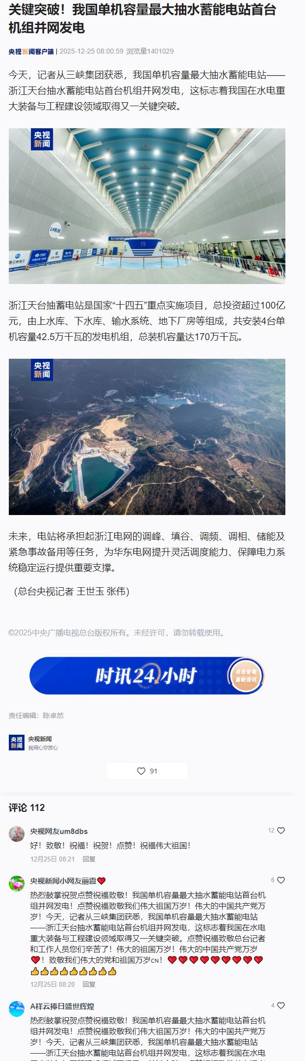 今天,记者从三峡集团获悉,我国单机容量最大抽水蓄能电站——浙江天台抽水蓄能电站首台机组并网发电,这标志着我国在水电重大装备与工程建设领域取得又一关键突破。