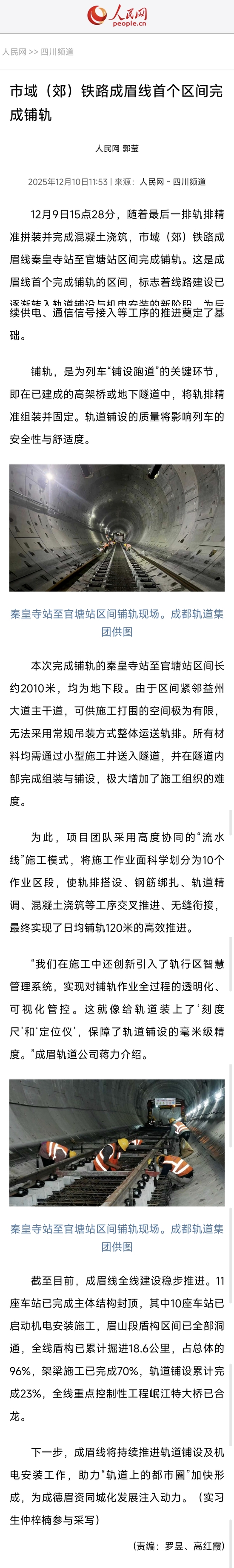 下一步,成眉线将持续推进轨道铺设及机电安装工作,助力“轨道上的都市圈”加快形成,为成德眉资同城化发展注入动力。