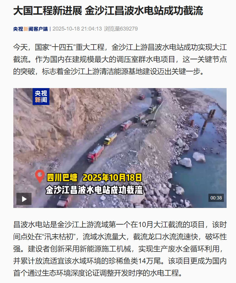 今天,国家“十四五”重大工程,金沙江上游昌波水电站成功实现大江截流。作为国内在建规模最大的调压室群水电项目,这一关键节点的突破,标志着金沙江上游清洁能源基地建设迈出关键一步。
