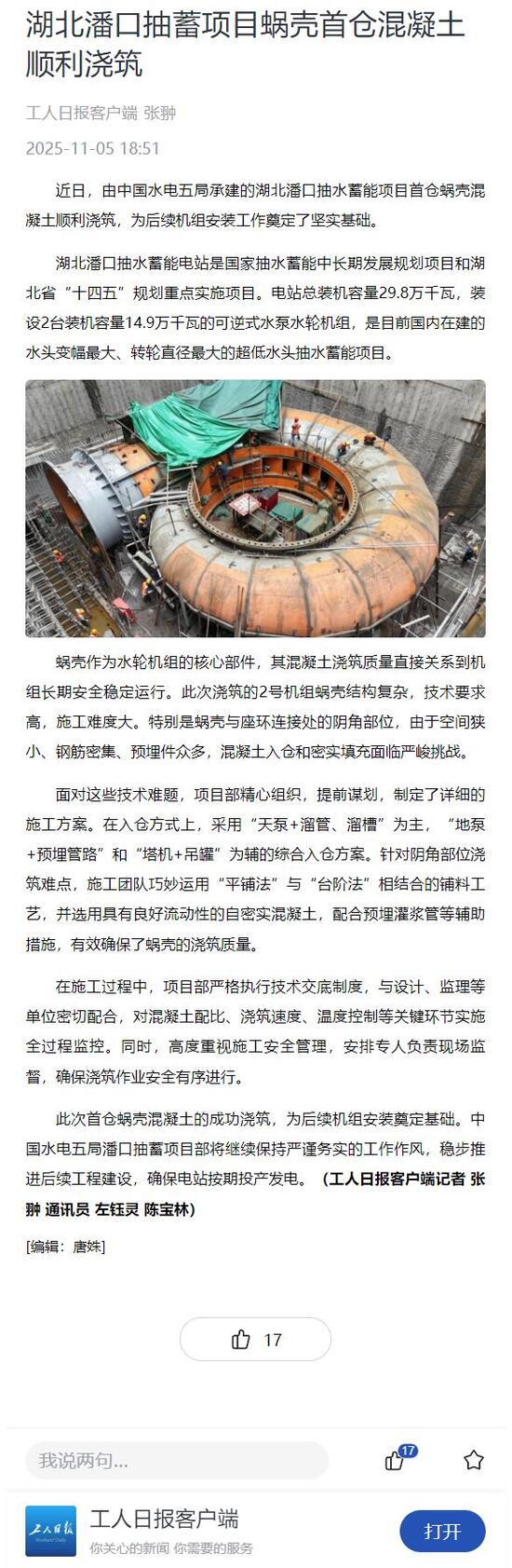 此次首仓蜗壳混凝土的成功浇筑,为后续机组安装奠定基础。中国水电五局潘口抽蓄项目部将继续保持严谨务实的工作作风,稳步推进后续工程建设,确保电站按期投产发电。(工人日报客户端记者 张翀 通讯员 左钰灵 陈宝林)