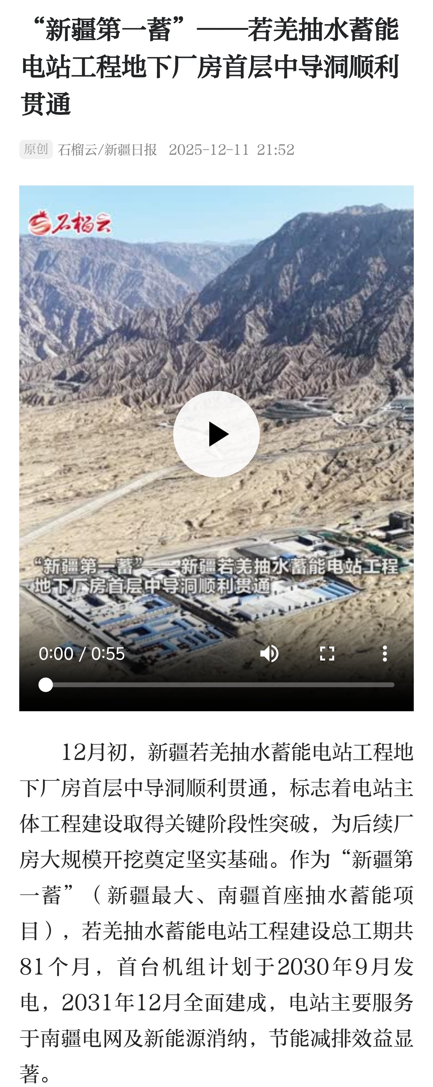12月初,新疆若羌抽水蓄能电站工程地下厂房首层中导洞顺利贯通,标志着电站主体工程建设取得关键阶段性突破,为后续厂房大规模开挖奠定坚实基础。作为“新疆第一蓄”(新疆最大、南疆首座抽水蓄能项目),若羌抽水蓄能电站工程建设总工期共81个月,首台机组计划于2030年9月发电,2031年12月全面建成,电站主要服务于南疆电网及新能源消纳,节能减排效益显著。