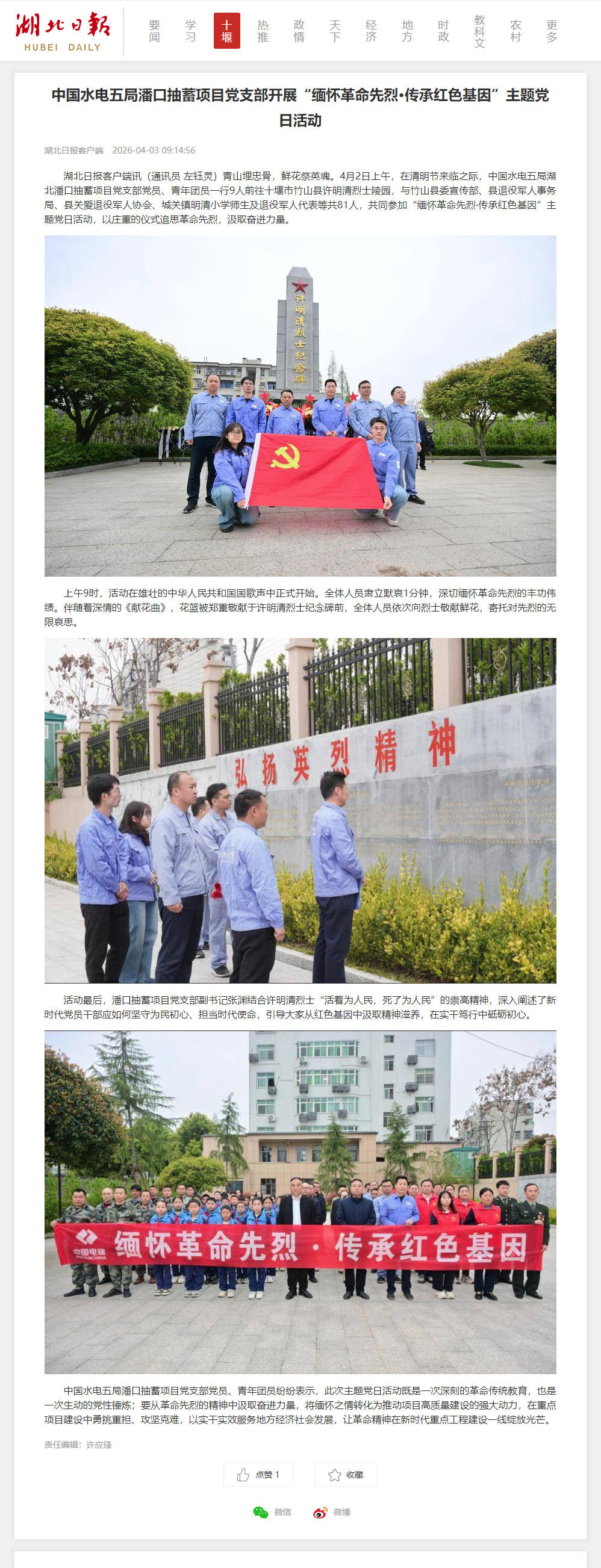湖北日报客户端讯(通讯员 左钰灵)青山埋忠骨,鲜花祭英魂。4月2日上午,在清明节来临之际,中国水电五局湖北潘口抽蓄项目党支部党员、青年团员一行9人前往十堰市竹山县许明清烈士陵园,与竹山县委宣传部、县退役军人事务局、县关爱退役军人协会、城关镇明清小学师生及退役军人代表等共81人,共同参加“缅怀革命先烈·传承红色基因”主题党日活动,以庄重的仪式追思革命先烈,汲取奋进力量。