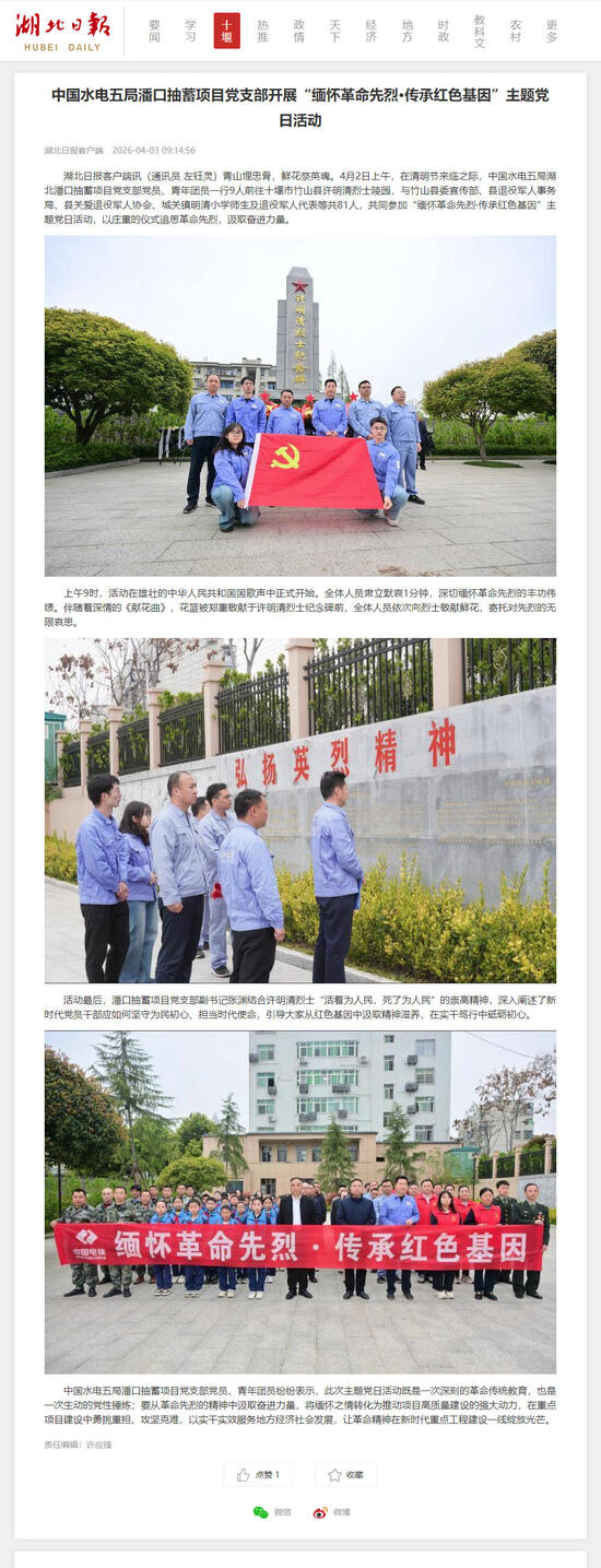 中国水电五局潘口抽蓄项目党支部党员、青年团员纷纷表示,此次主题党日活动既是一次深刻的革命传统教育,也是一次生动的党性锤炼;要从革命先烈的精神中汲取奋进力量,将缅怀之情转化为推动项目高质量建设的强大动力,在重点项目建设中勇挑重担、攻坚克难,以实干实效服务地方经济社会发展,让革命精神在新时代重点工程建设一线绽放光芒。