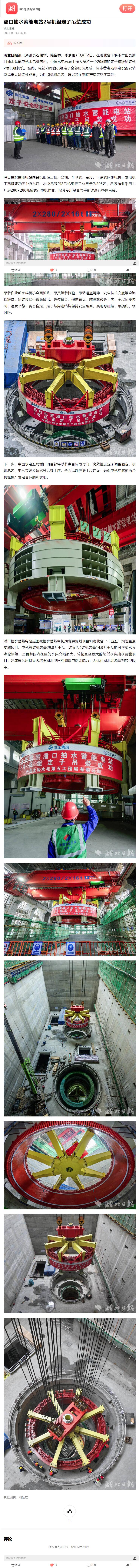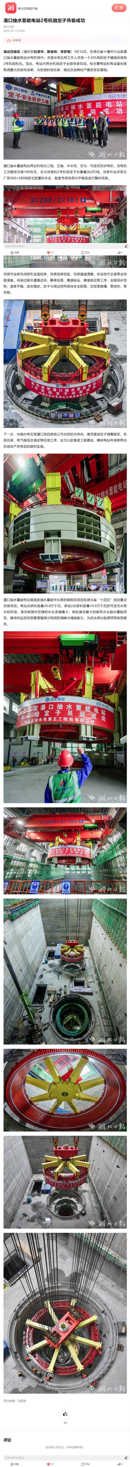 湖北日报讯(通讯员石濡华、陈宝林、李梦雨)3月12日,在湖北省十堰市竹山县潘口抽水蓄能电站水电机房内,中国水电五局工作人员将一个205吨的定子精准吊装到2号机组机坑。至此,电站内两台机组定子全部吊装完成,标志着电站机电设备安装取得重大阶段性成果,为后续机组总装、调试及按期投产奠定坚实基础。
