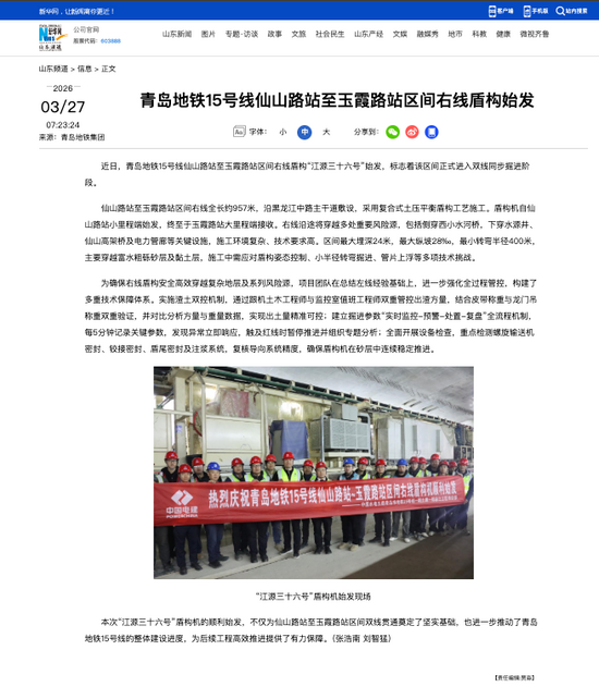 本次“江源三十六号”盾构机的顺利始发,不仅为仙山路站至玉霞路站区间双线贯通奠定了坚实基础,也进一步推动了青岛地铁15号线的整体建设进度,为后续工程高效推进提供了有力保障。(张浩南 刘智猛)