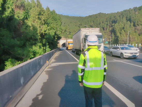 现场,小货车装载的动物内脏等易腐货物因车辆侧翻大面积散落,不仅产生刺鼻异味,更导致路面湿滑,给通行安全带来极大隐患,后方车辆随即出现积压。对此,路巡中队采取“退防式预警”措施,在后方3号隧道处部署人员现场指挥、喊话提示,避免二次事故发生。