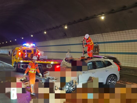 当日上午8时许,路巡中队接到事故信息后,第一时间组织救援力量迅速赶赴事故现场。为防范风险扩大,救援人员对事故路段第一、二车道实施交通管控,同步协调关闭隧道第三车道指示灯,并通过隧道入口及沿线电子显示屏发布警示信息,引导后方车辆减速避让。