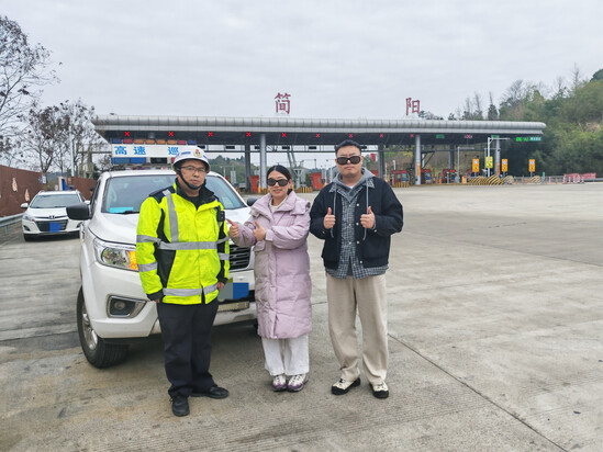 了解情况后,路巡队员表示:“不要着急,我们巡逻路线会经过简阳收费站,一定会帮助你们安全解决问题。”考虑到服务区内车流穿梭频繁,人车混行存在安全隐患,且两人情绪较为焦虑,路巡队员当即决定使用巡逻车护送他们至前方最近的简阳收费站,以便他们能够安全、快速地联系亲友或重新安排行程。