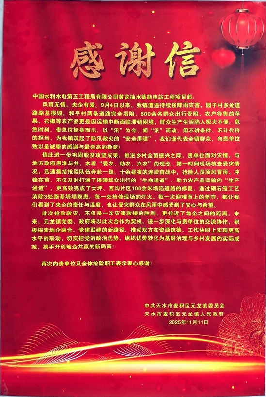 日前,中共天水市麦积区元龙镇委员会、元龙镇人民政府向水电五局黄龙项目送来感谢信和锦旗,对水电五局黄龙项目在当地抢险救灾工作中展现的央企担当予以高度肯定。