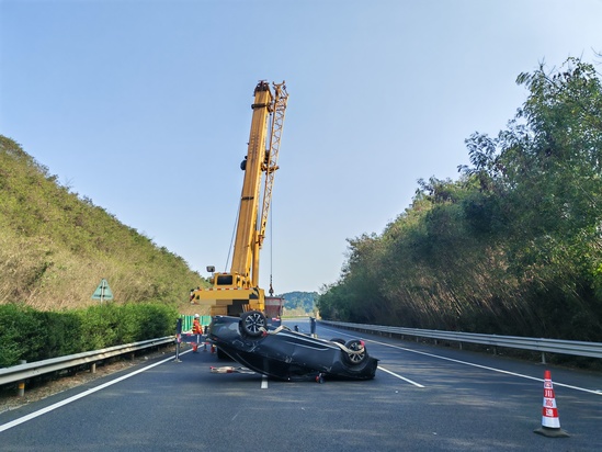10分钟后,高速交警与施救队伍相继抵达。各方迅速分工协作、高效联动。高速交警接手现场管控工作,优化疏导方案,确保救援通道畅通;施救人员立即投入救援作业,调配吊车对侧翻车辆进行稳妥起吊与转运。经过20分钟紧张作业,事故车辆被安全拖离。随后,路巡人员快速清理现场,撤除警示标志,确认道路无安全隐患后,该路段交通全面恢复正常。