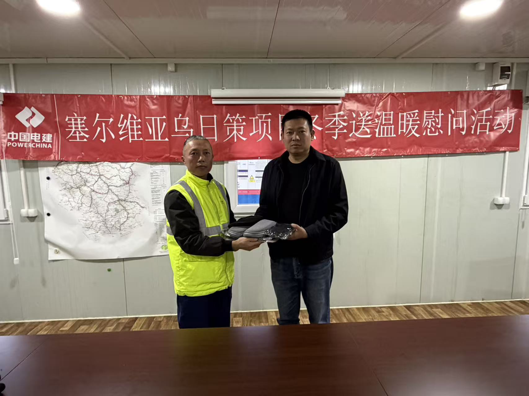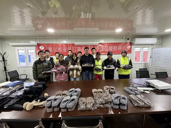 12月1日,塞尔维亚乌日策绕城公路项目驻地银装素裹,气温骤降。项目部特别举行"冬日温情暖人心"关怀活动,为奋战在海外建设一线的中方员工送上贴心御寒物资。