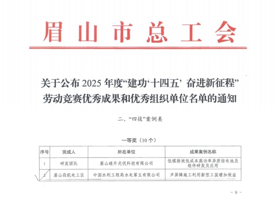 近日,由成眉机电项目申报的《声屏障施工利用新型工装增加效益》成果,获眉山市2025年度“建功‘十四五’奋进新征程”劳动竞赛优秀成果案例一等奖。