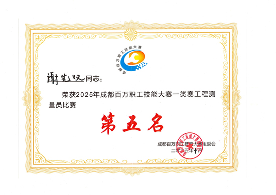 10月22日至24日,由成都市总工会、成都市人力资源和社会保障局主办的2025年成都百万职工技能大赛工程测量员比赛圆满落幕。水电五局一公司测量大队谢先双凭借扎实的专业素养与稳定的现场发挥,在来自成都市37家单位、近百名测量技能人才的同台竞技中脱颖而出,最终荣获个人第五名的优异成绩。