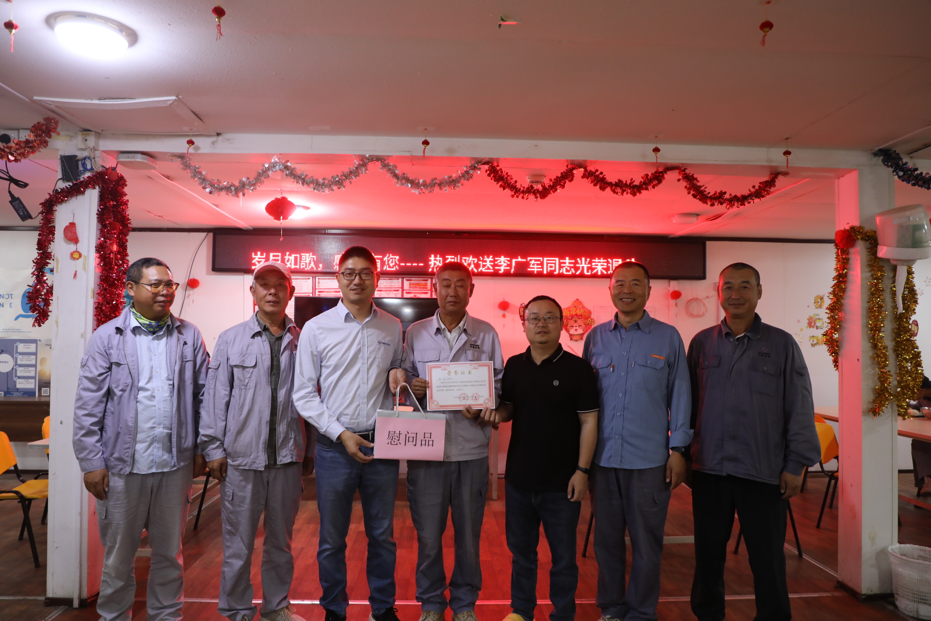 当天,沙特国王港项目营地会议室里暖意融融,一场以“岁月如歌,感谢有您”为主题的退休职工欢送会在此举行。项目工会主席、项目负责人及同事代表齐聚一堂,向在海外项目一线坚守至最后一刻的老员工李广军同志,致以最崇高的敬意和最真挚的祝福。