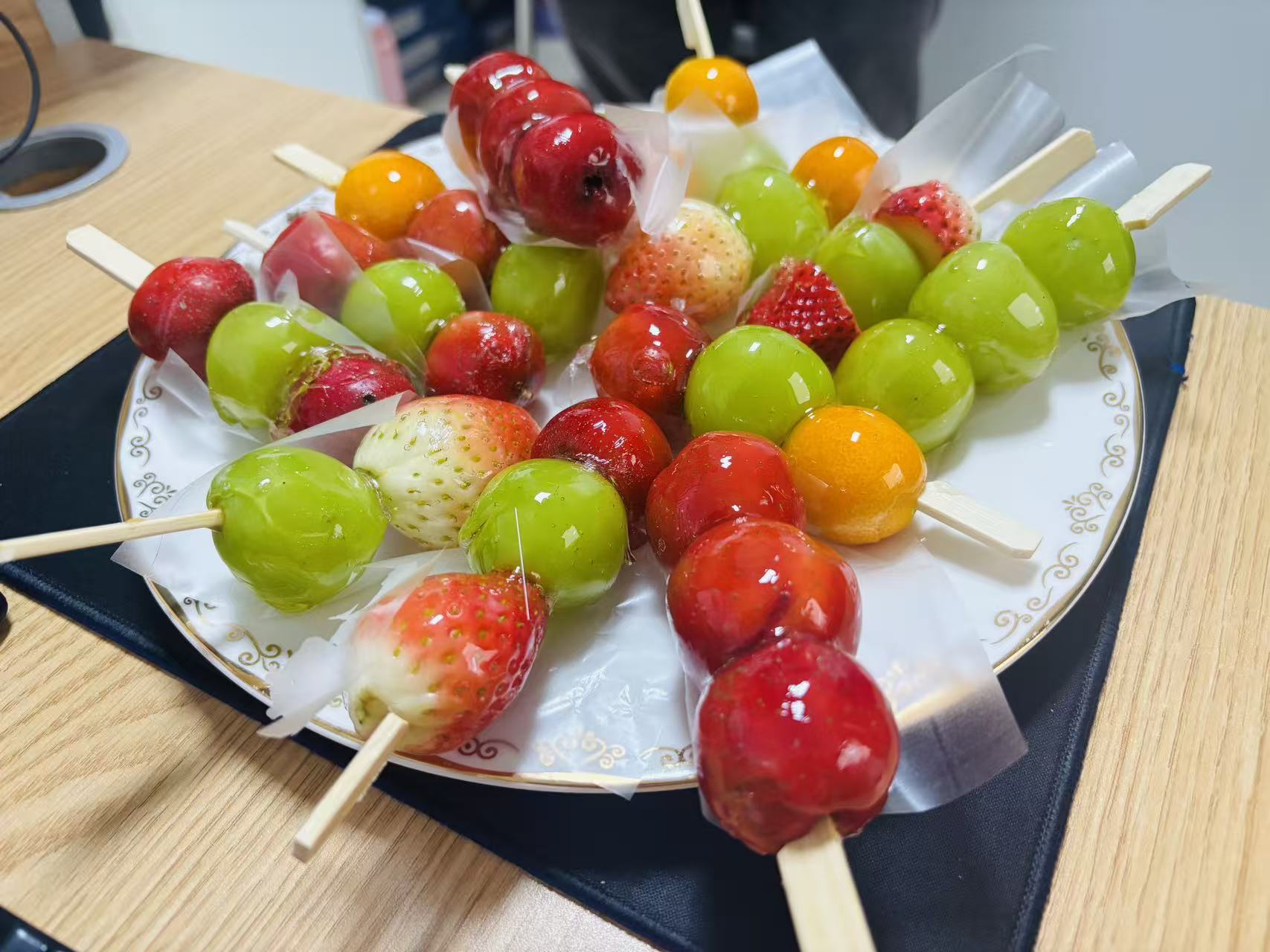教学环节结束后,制作现场氛围热闹无比,有人负责清洗水果,将各类鲜果仔细冲洗干净、沥干水分,确保食材新鲜卫生;有人专注熬制糖浆,手拿长勺不停搅拌,眼神紧盯锅中糖浆的色泽与状态,待糖浆泛起细密泡沫、呈现出琥珀色时,立刻示意可以裹糖;擅长手工的职工则熟练地将山楂、草莓等水果串成串,一串串色彩鲜艳的果串整齐排列,充满喜庆感。